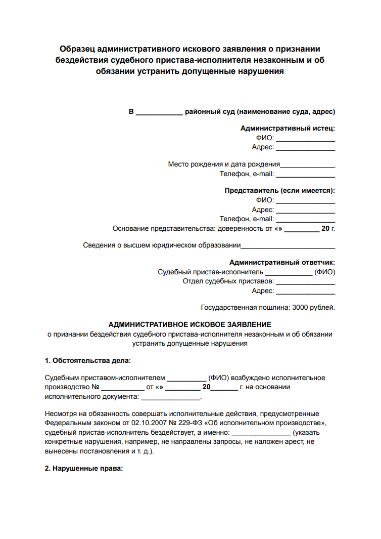 Образец административного искового заявления о признании бездействия судебного пристава-исполнителя незаконным и об обязании устранить допущенные нарушения