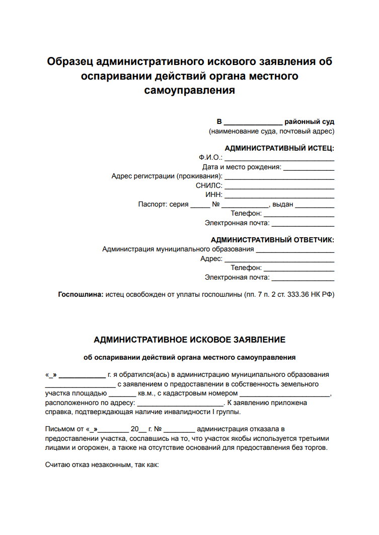 Образец административного искового заявления об оспаривании действий органа местного самоуправления