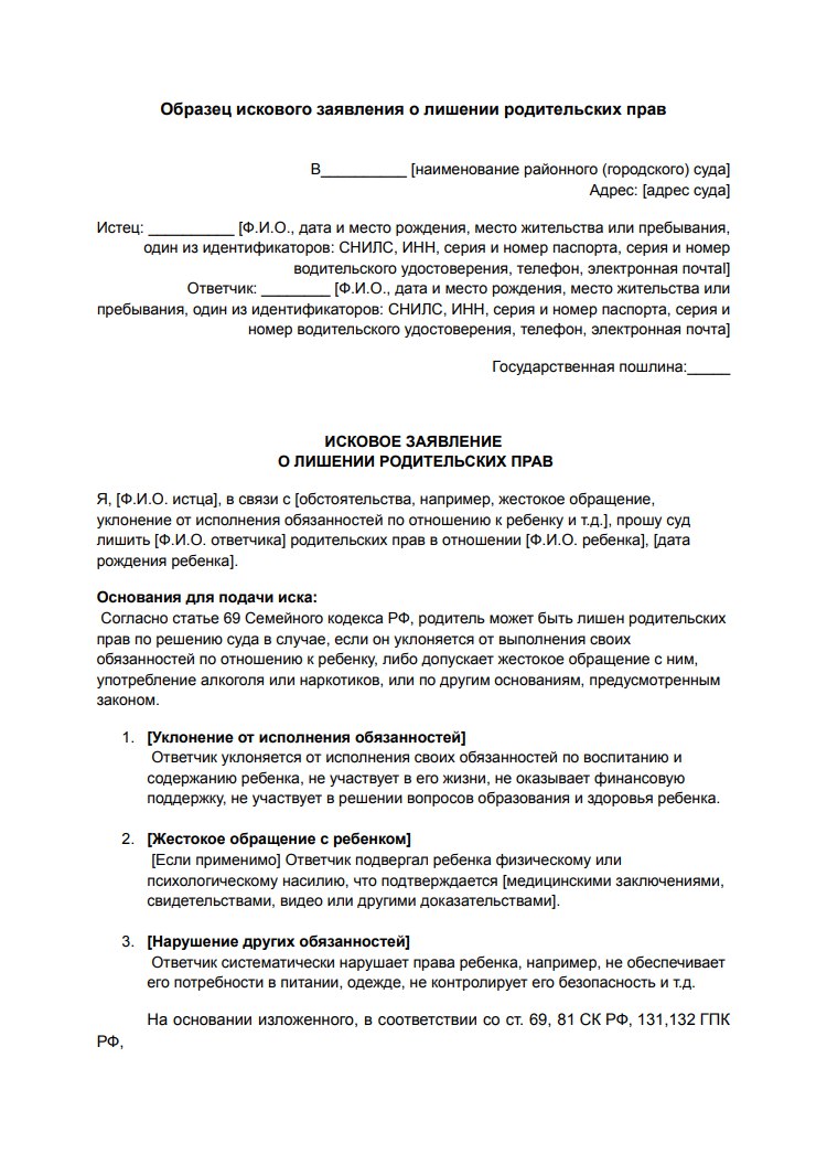 Исковое заявление о лишении родительских прав подается в случае, если один из родителей не выполняет свои обязанности по отношению к ребенку или действует в его интересах ненадлежащим образом. Основания для подачи иска могут быть следующие:
