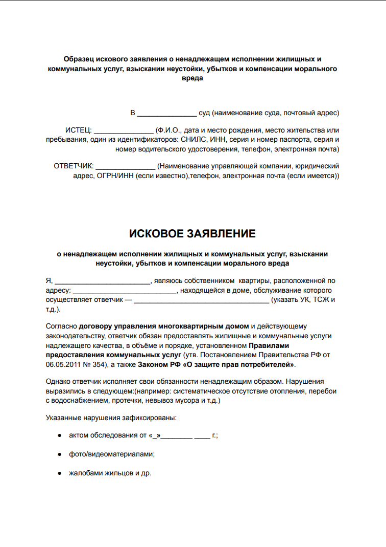 Образец искового заявления о ненадлежащем исполнении жилищных и коммунальных услуг, взыскании неустойки, убытков и компенсации морального вреда