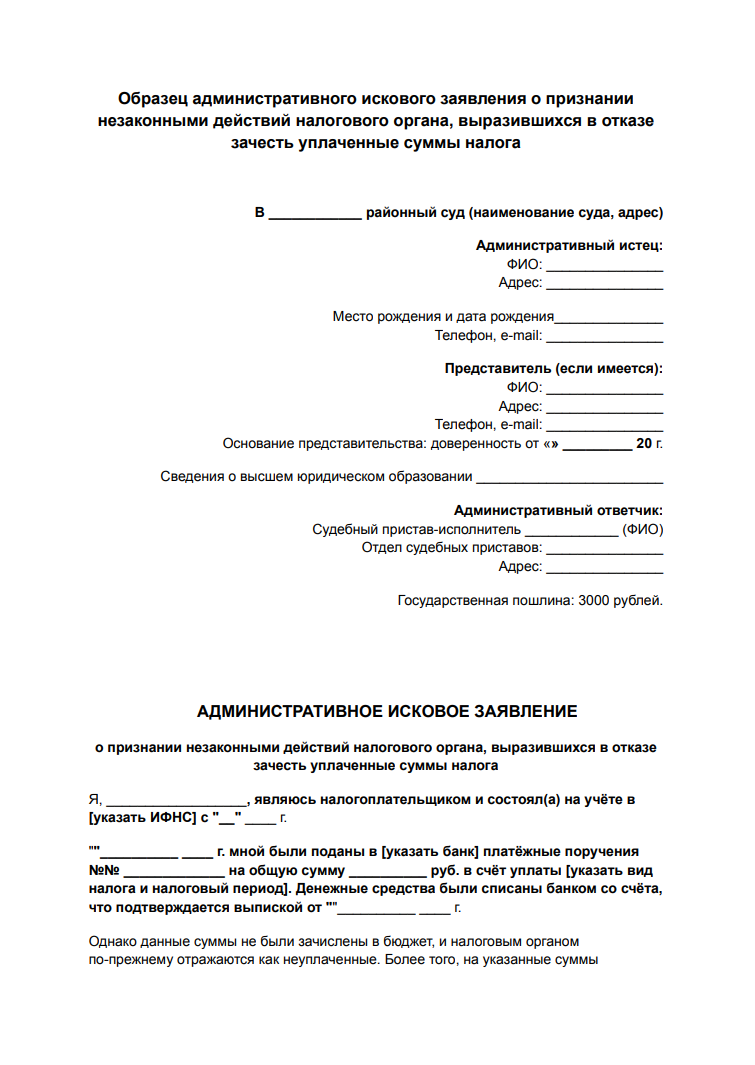 Образец искового заявления о признании незаконными действий налогового органа, выразившихся в отказе зачесть уплаченные суммы налога
