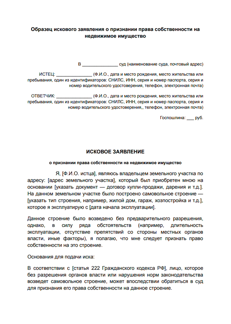 Образец искового заявления о признании права собственности на недвижимое имущество