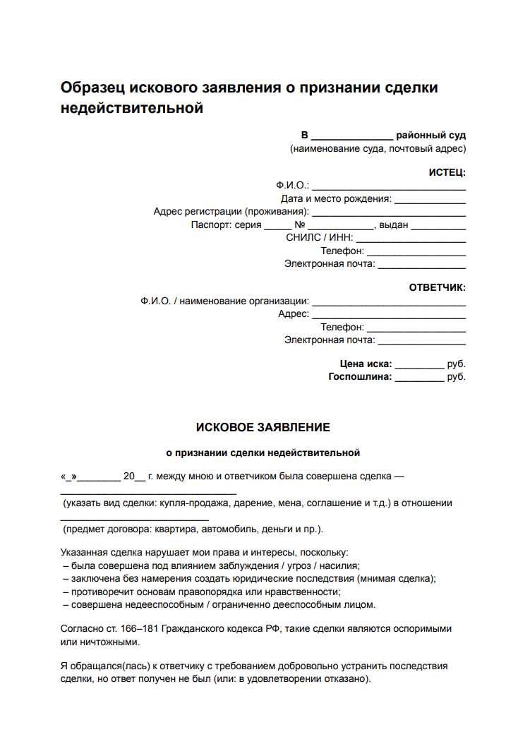 Образец искового заявления о признании сделки недействительной