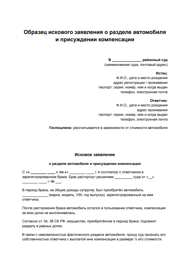 Образец искового заявления о разделе автомобиля и присуждении компенсации