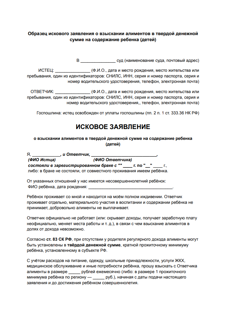 Образец искового заявления о взыскании алиментов в твердой денежной сумме на содержание ребенка (детей)