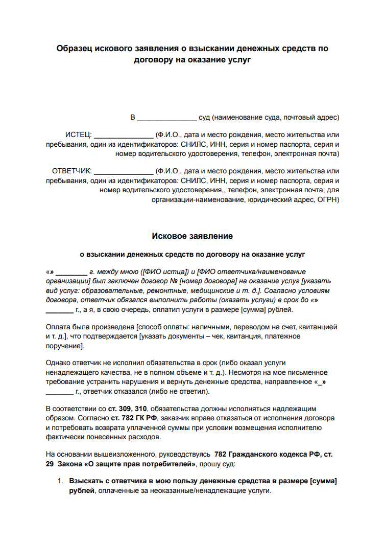 Этот образец искового заявления поможет вам правильно оформить обращение в суд, если ваш договор на оказание услуг был нарушен.