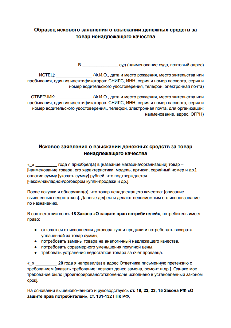 Образец искового заявления о взыскании денежных средств за товар ненадлежащего качества