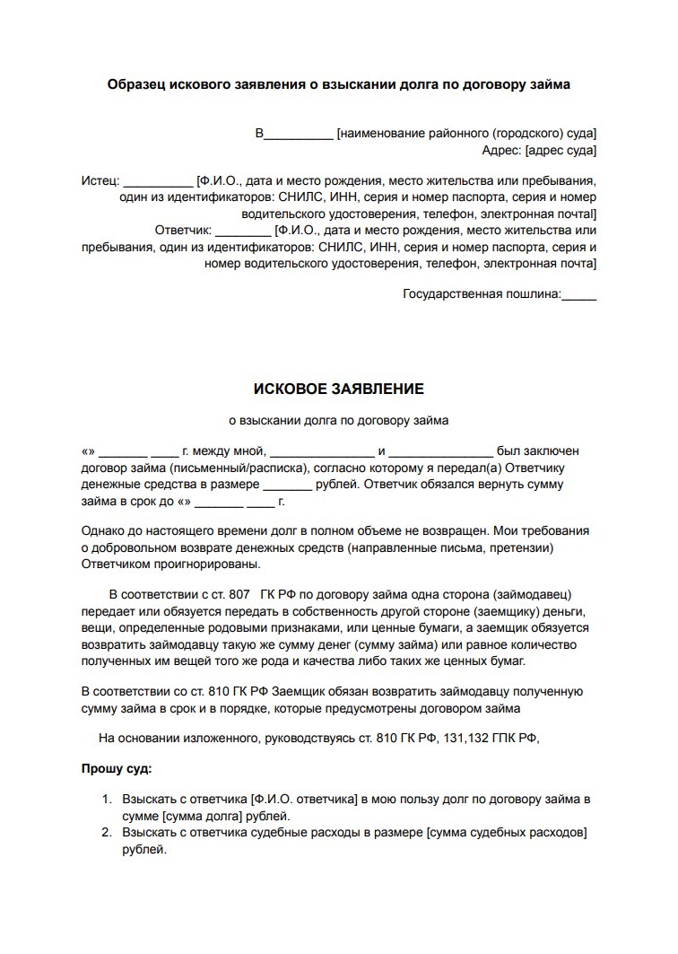 Подача иска в таких случаях обязательна, если заемщик не реагирует на досудебные попытки решить проблему. Главное, чтобы у вас были все доказательства: расписка, договор займа, переписка с должником и другие документы, подтверждающие факт возникновения долга.