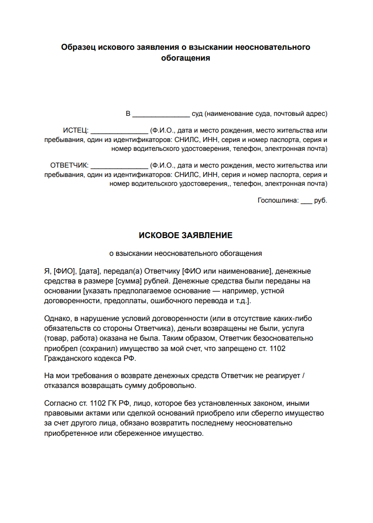 Образец искового заявления о взыскании неосновательного обогащения