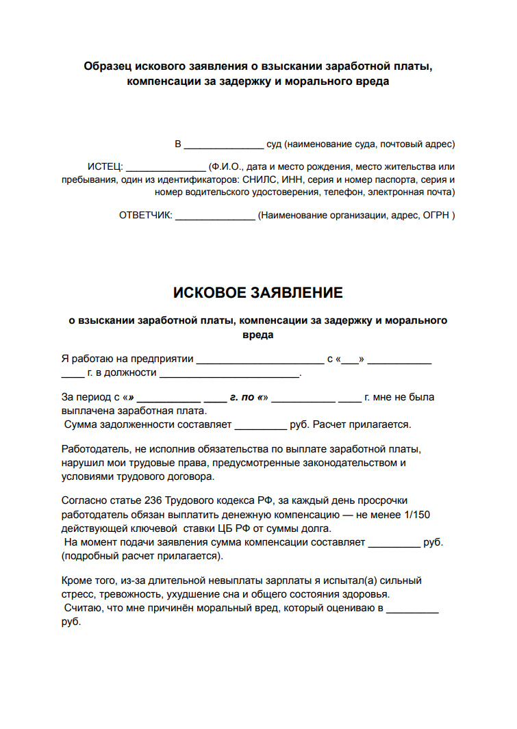 Образец искового заявления о взыскании заработной платы, компенсации за задержку и морального вреда