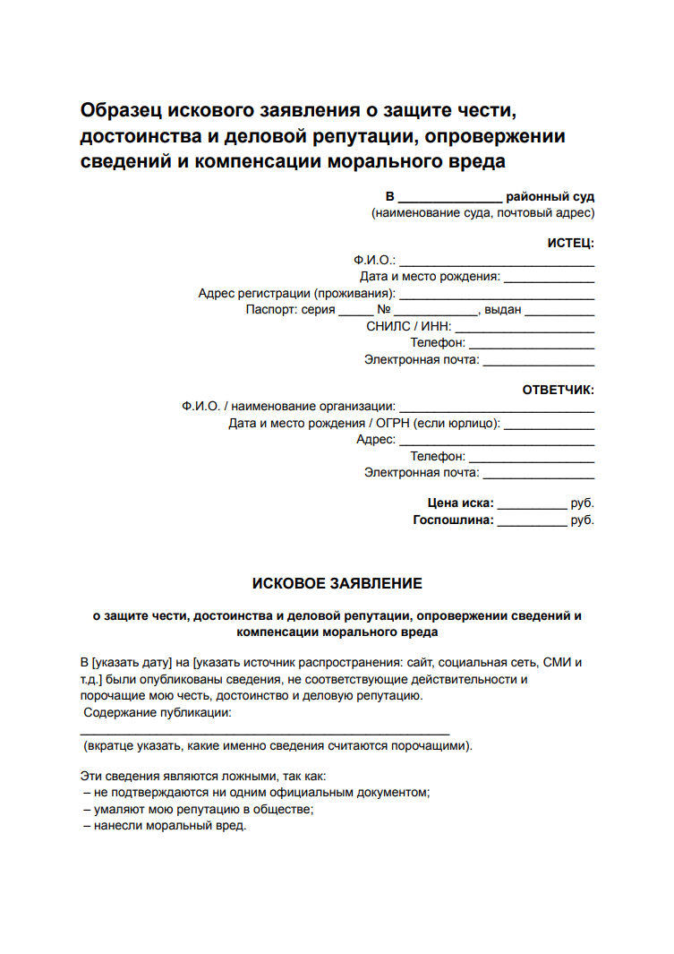 В статье представлен образец искового заявления о защите чести, разъяснения по составлению, список необходимых документов и советы, как доказать моральный вред.