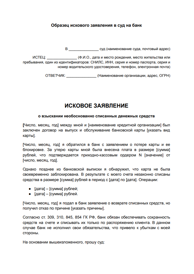 Образец искового заявления о защите прав потребителя и взыскании денежных средств с банка