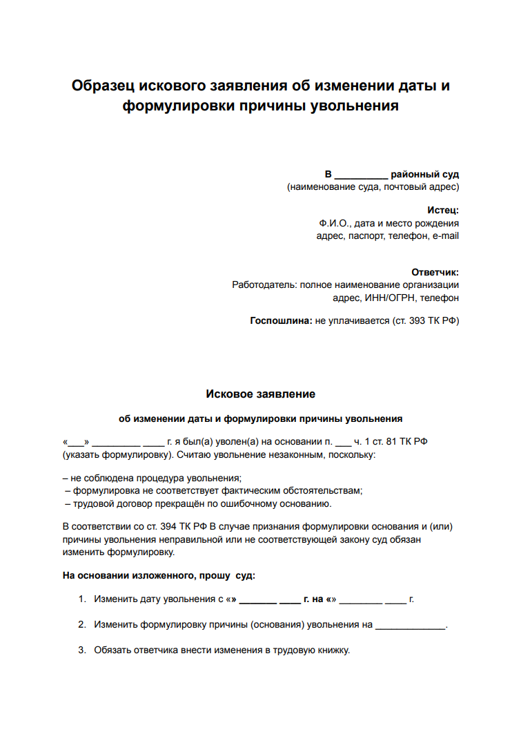 Образец искового заявления об изменении даты и формулировки причины увольнения