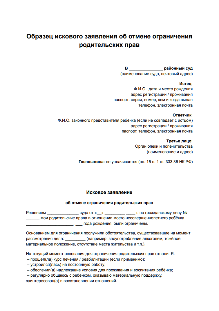 Образец искового заявления об отмене ограничения родительских прав