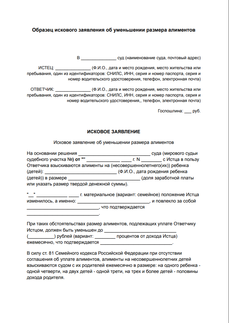 Образец искового заявления об уменьшении размера алиментов