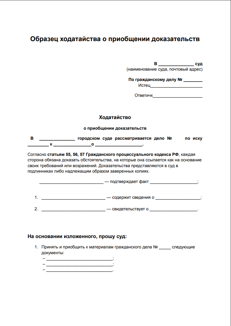 Обязательно укажите: – номер дела и наименование сторон; – перечень документов, которые нужно приобщить; – обоснование, почему они важны для дела; – ссылки на статьи 55–57 ГПК РФ.