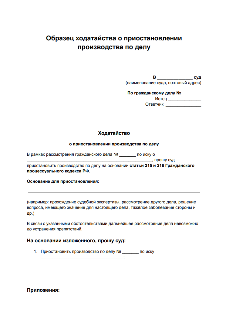 Если объективные обстоятельства мешают рассматривать дело, не молчите — подайте ходатайство о приостановлении. Суд не может отказать без оснований. Скачайте актуальный образец на этой странице и получите консультацию юриста при необходимости.