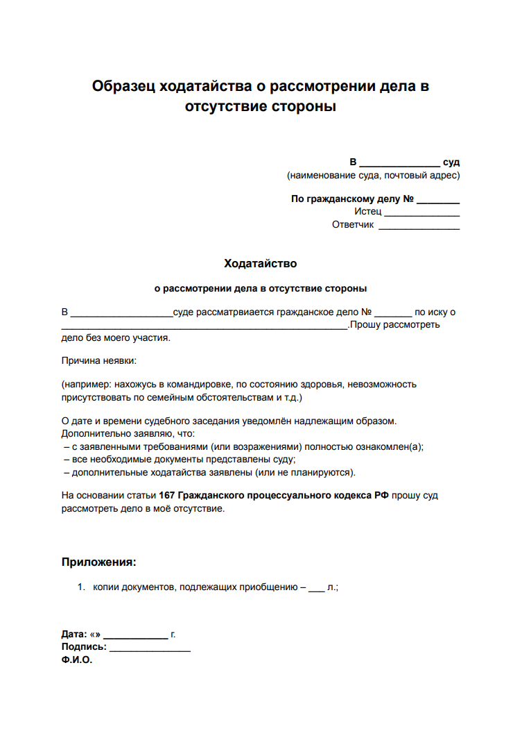 Образец ходатайства о рассмотрении дела в отсутствие стороны