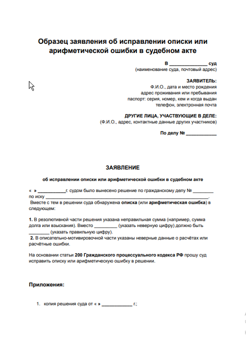Образец заявления об исправлении описки или арифметической ошибки в судебном акте