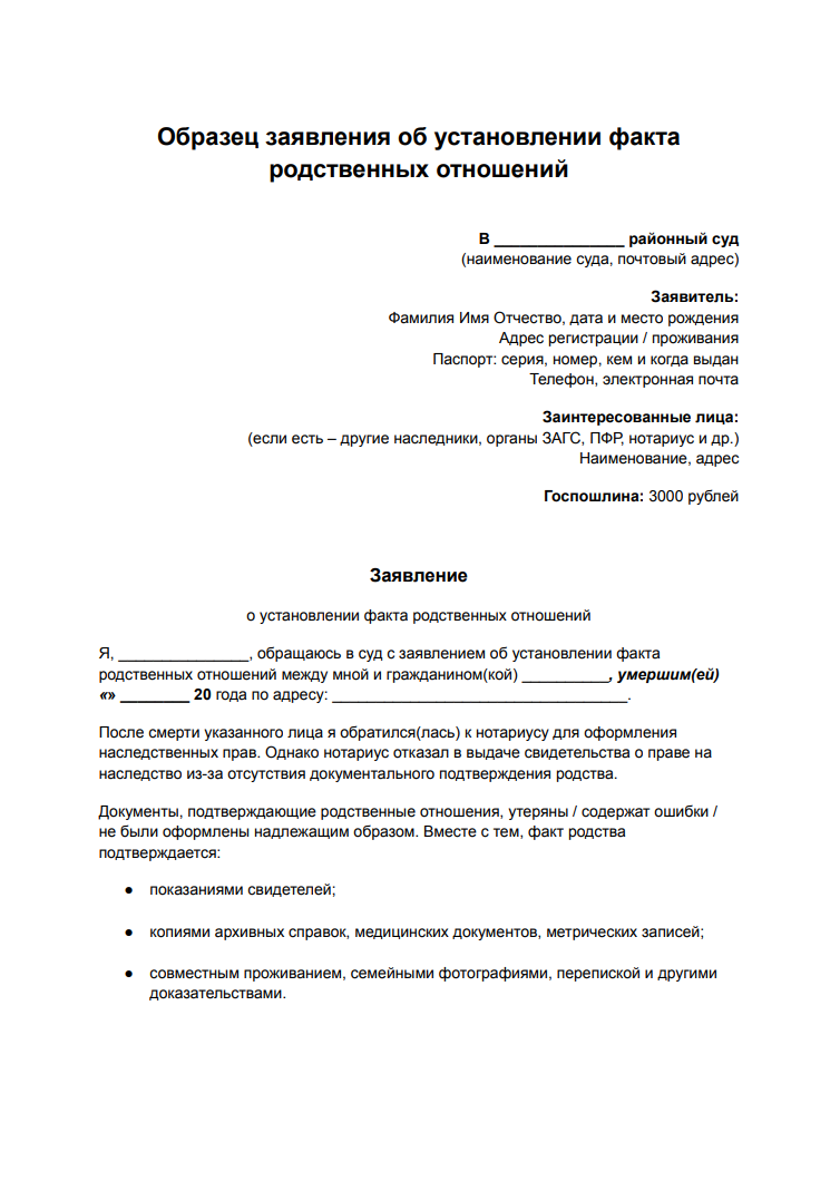 Когда невозможно подтвердить родственные связи через органы ЗАГС — например, документы утрачены, допущены ошибки или запись отсутствует в архивах — факт родства можно установить через суд. В статье рассказываем, в каких случаях подаётся такое заявление, какие доказательства нужно приложить, как правильно его составить и куда подать. Приведён актуальный образец, список документов и полезные советы.